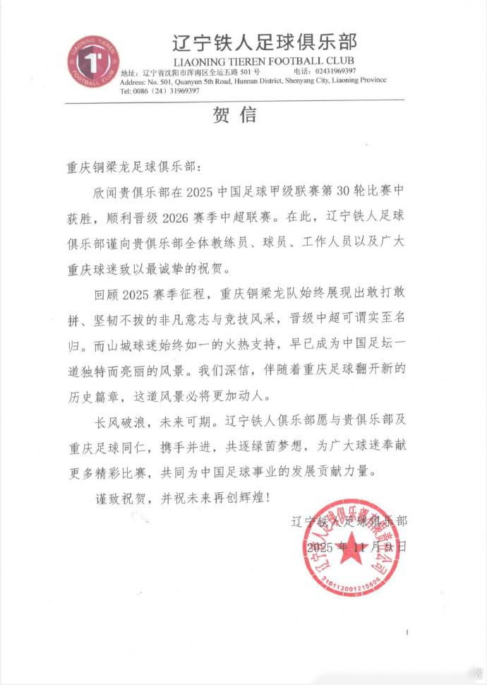欣闻贵俱乐部在2025中国足球甲级联赛第30轮比赛中获胜,顺利晋级2026赛季中超联赛。在此,辽宁铁人足球俱乐部谨向贵俱乐部全体教练员、球员、工作人员以及广大重庆球迷致以最诚挚的祝贺。